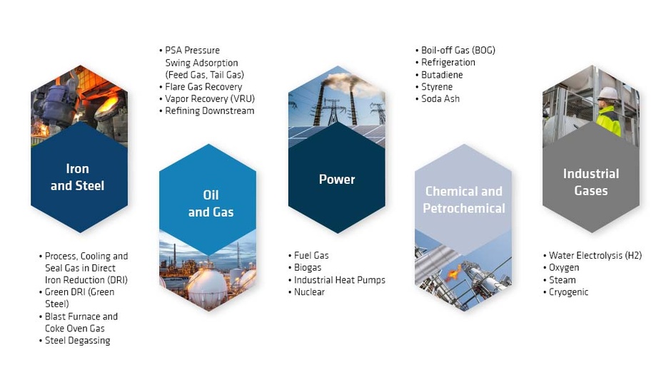 Les applications dans l'industrie des gaz de process sont très variées. La compression ou le traitement de l'air et des gaz de process sont nécessaires dans tous les secteurs industriels clés, y compris dans les zones critiques ou exigeantes. Par exemple, dans l'industrie des procédés chimiques, l'industrie pétrochimique, les raffineries, la production d'énergie, le transport du pétrole et du gaz, la production de gaz industriels, l'industrie du froid industriel, onshore et offshore, le refroidissement et la liquéfaction de l'hélium, les brasseries, l'industrie alimentaire et pharmaceutique ou les cokeries.